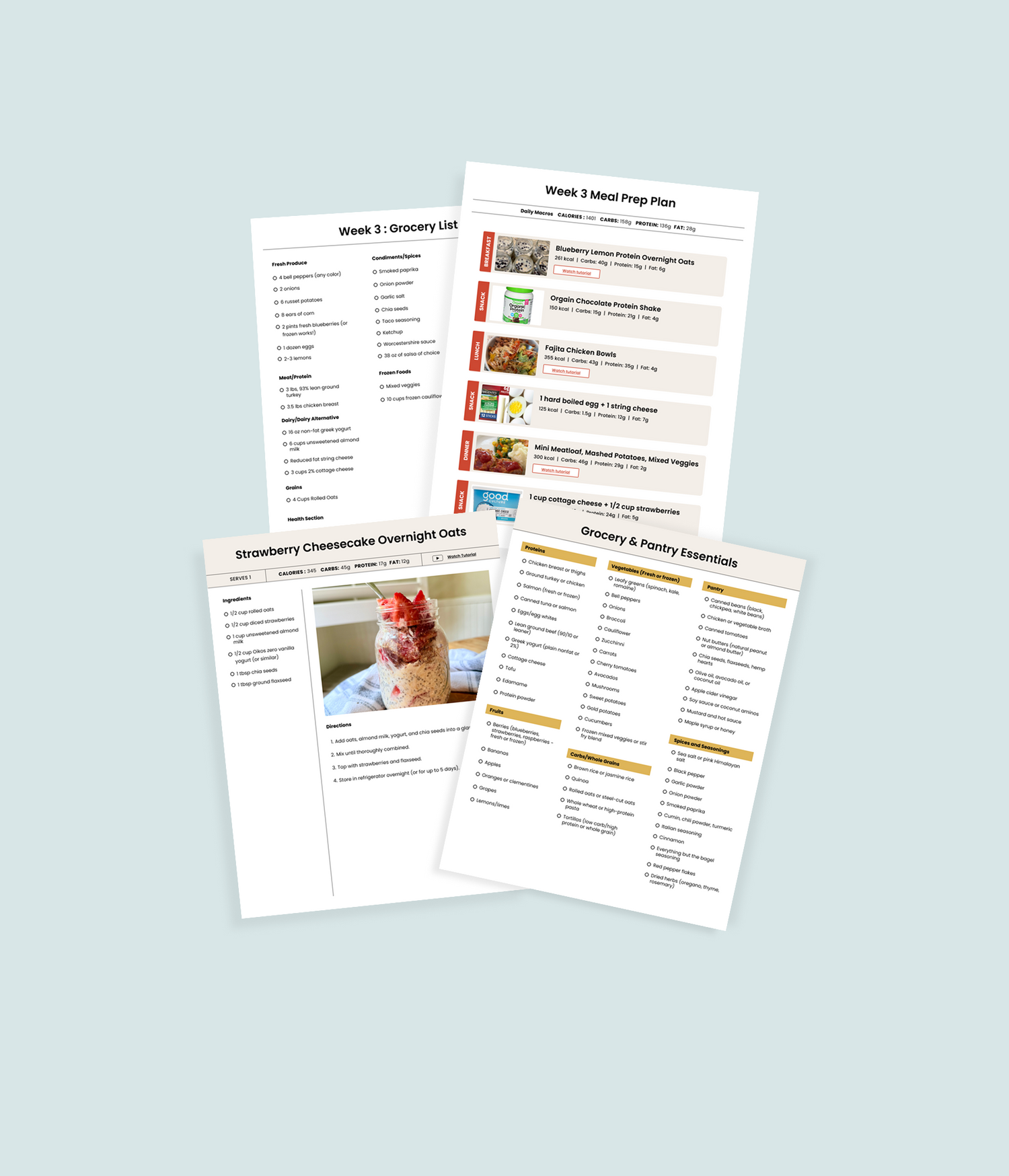 Built for busy weeks and real routines, this high-protein meal plan includes everything you need to eat well without the overwhelm. With done-for-you recipes, grocery lists, and step-by-step video guides, you’ll feel organized, nourished, and one step ahead.